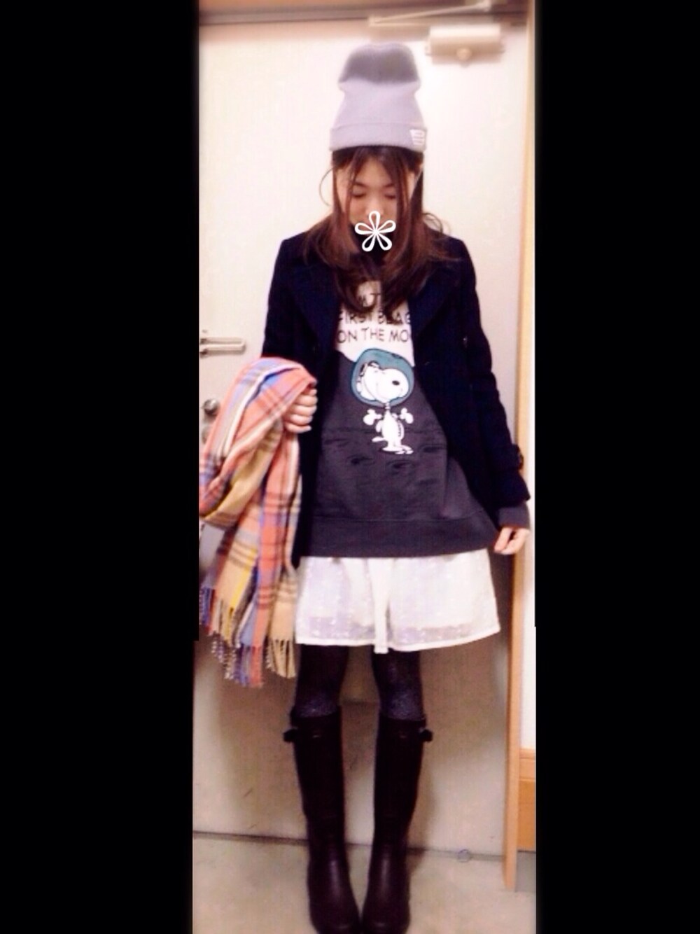 スヌーピーのスウェットが メインなコーデ♡ ラメタイツでパンチを効かせてみました! スウェット:UNIQLO スカート:earth music & ecology ストール:LOWRYS FARM