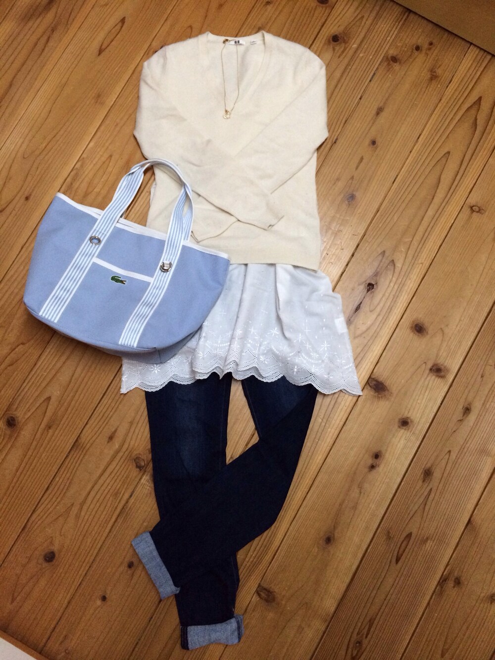 ニット、デニム:UNIQLO バック:ラコステ バックメインのコーデ❀.(*´◡`*)❀.