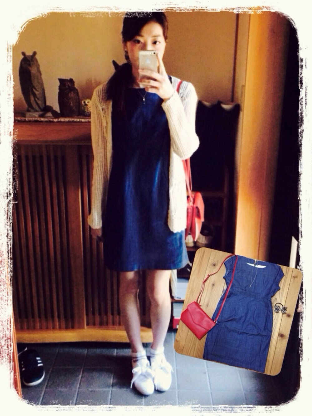 デニムワンピ:thprycolor カーデ:UNIQLO スニーカー:adidas thprycolorのワンピ初下ろし♡ 今日は暑くてワンピのみでも過ごせました! バックとめっちゃ合う〜♡( ᵕ̤ૢᴗᵕ̤ૢ )♡