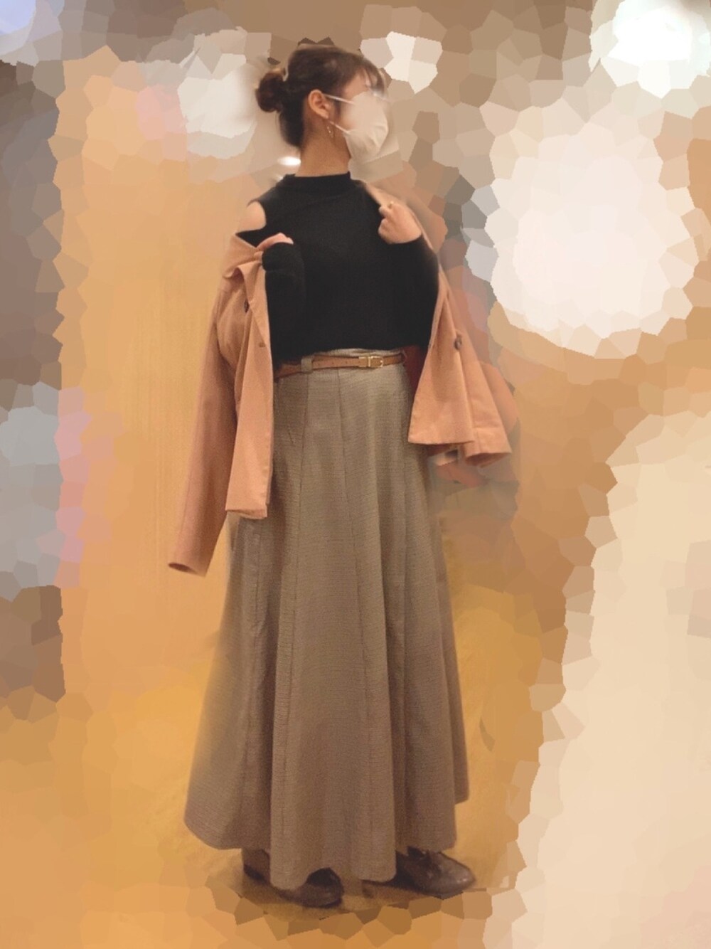 久々のジャケットコーデ🎈 スカートにジャケットって難しくてあまり合わせられなかったんだけど、このスカートは縦ラインが綺麗なのでぴったりでした! トップスは片方の肩空きなので程よい肌見せで、デートにもってこいです💓 首元は詰まってるので髪型はお団子でアップに