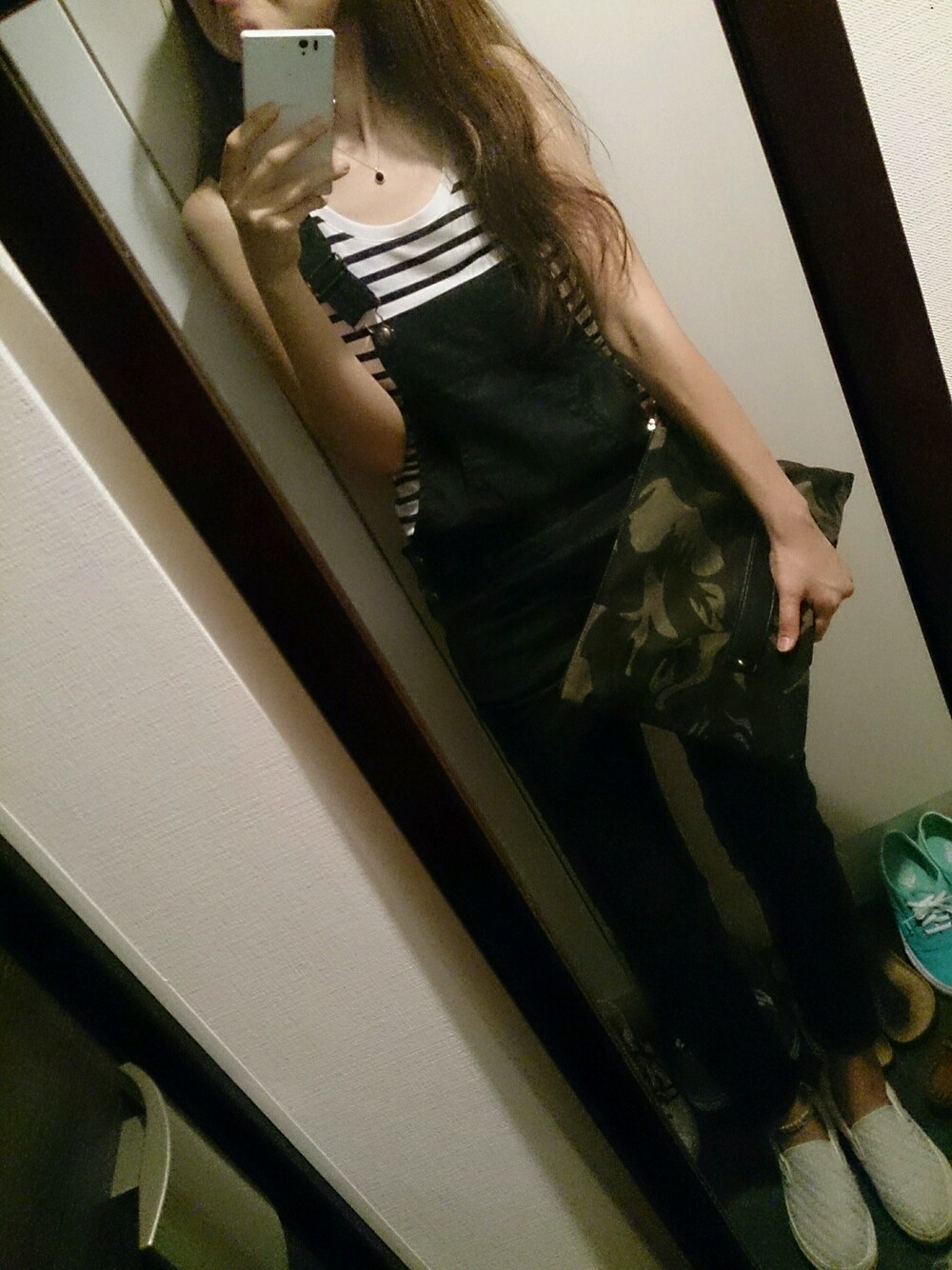 yukaのサロペット/オーバーオール「BLACKコーティング オーバーオール♪」を使ったコーディネート