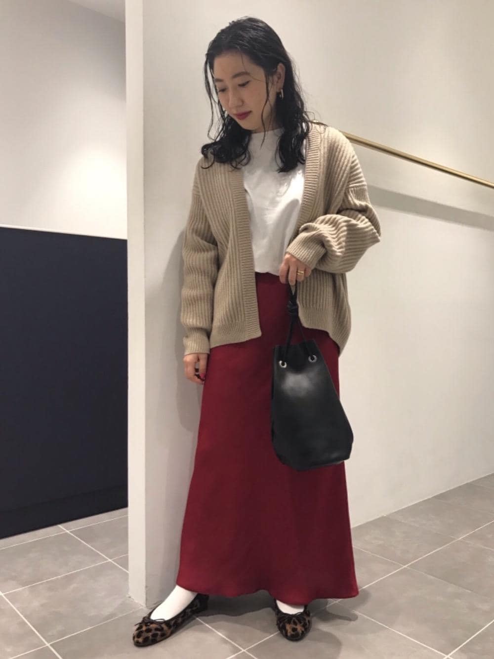 身長(150cm) 着用サイズ(全てフリーサイズ、シューズのみ23.5cm) パキッとした色をスカートにもってきたので、トップスなどはベージュやホワイトで柔らかくまとめました。無地ばかりで全体的に重くならないようにパンプスはレオパードにしています。