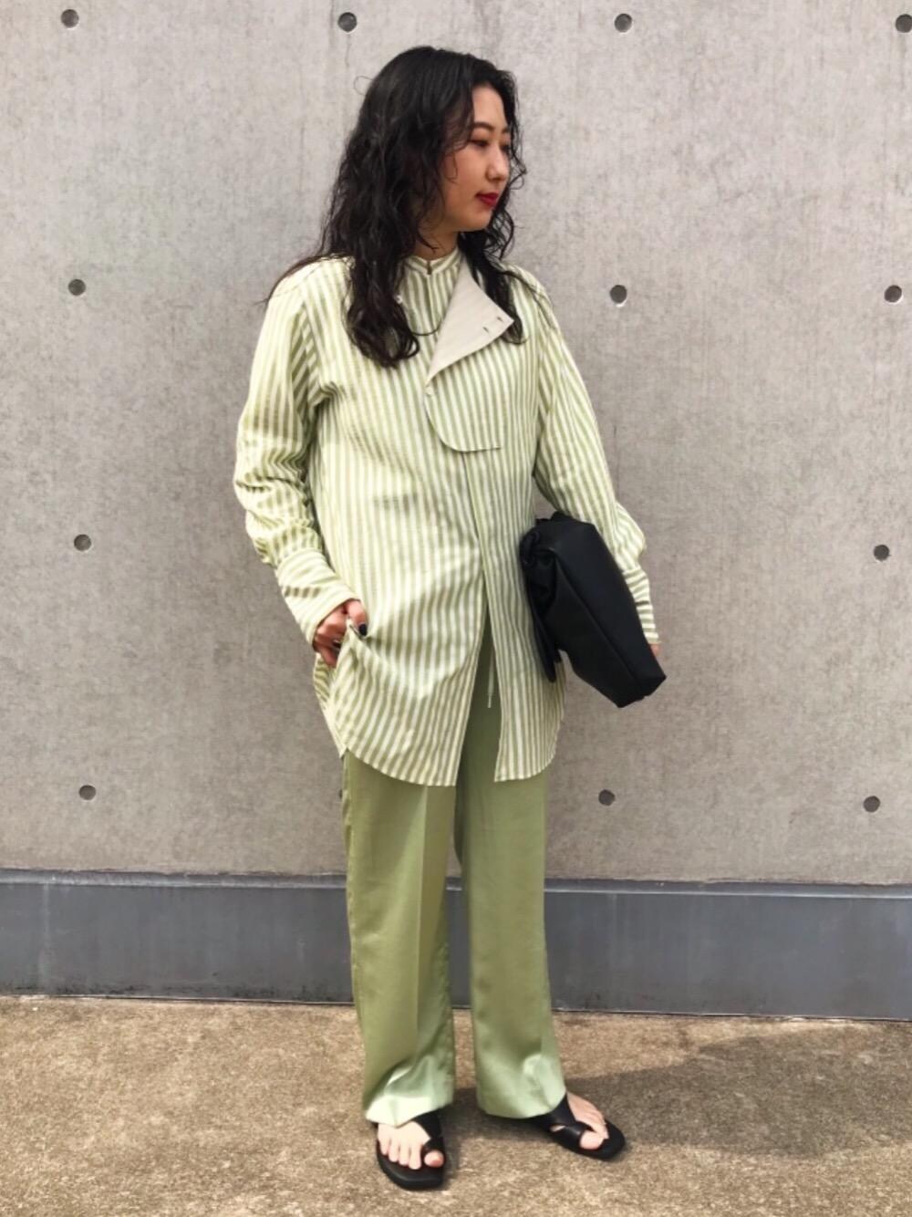 身長150cm 着用サイズ【シャツ:free パンツ:36 サンダル:M】 今年らしいカラーのシャツとパンツを合わせてワントーンコーデにしました。色がばらけないように小物はブラックで締めました。春らしいお色物を着て気分を上げたいですね♪