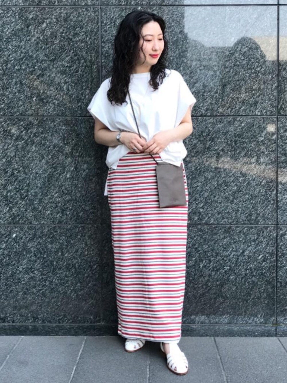 【身長:150cm】 カラフルなボーダーのスカートに白のカットソーを合わせてさりげなくオシャレなゆるっと休日スタイルです♪