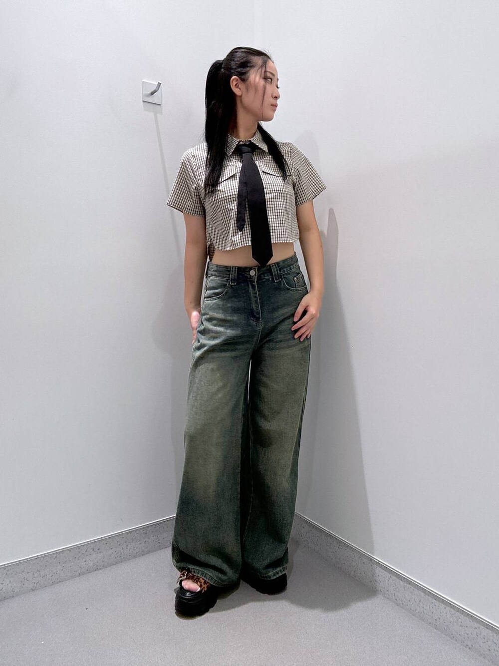 🌟トップス 取り外し可能なネクタイ付きのクロップド丈のシャツ✨✨ ネクタイ付きできれいめに、ネクタイを外してカジュアルな羽織りとして、様々な着用の仕方が楽しめちゃいます🩷 🌟ボトムス 全体的に加工を施したヴィンテージ感のあるデニム♡ 太めのシルエットで着回しがしやすく、一年中着用できる万能アイテムです😘