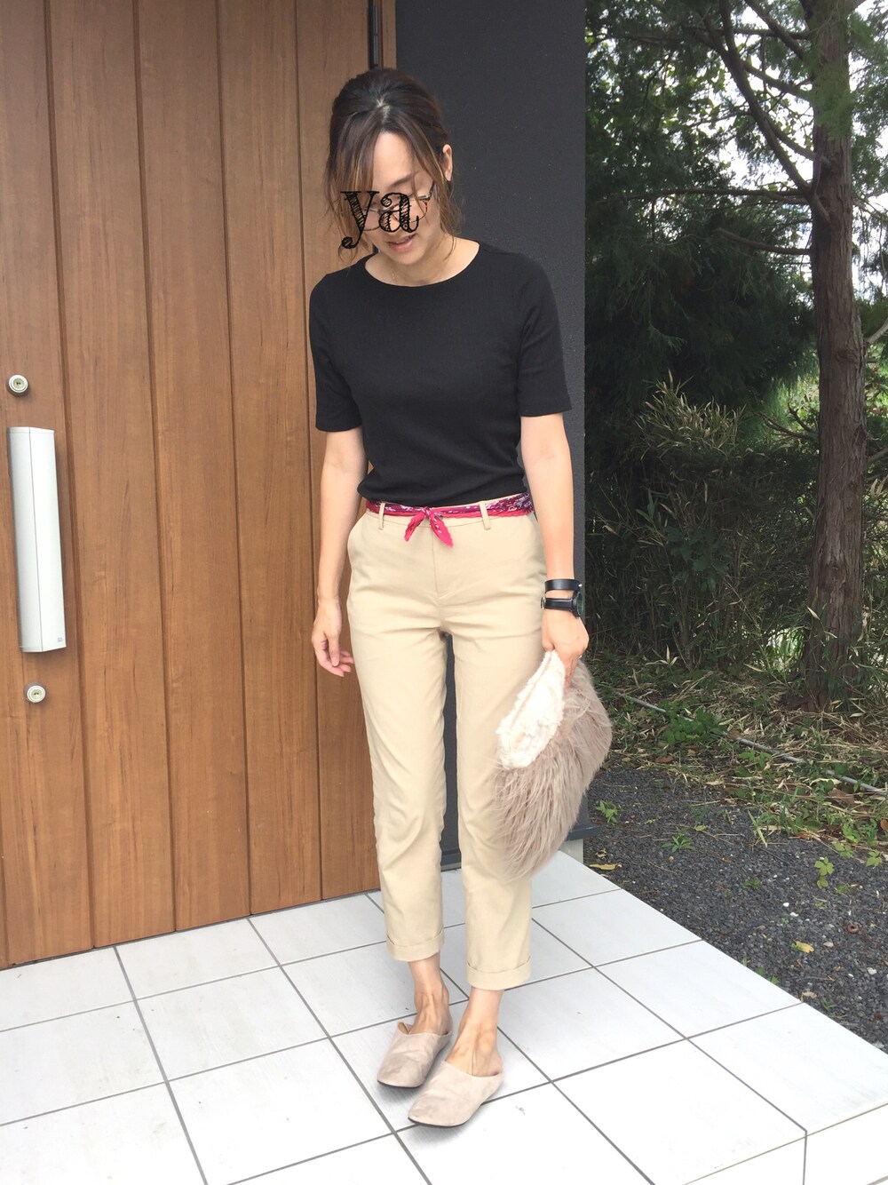 UNIQLOのリブボートネックにベージュのパンツ、ベルトにUNIQLOのスカーフを巻いてみました★ 欲しい物いっぱいーー
