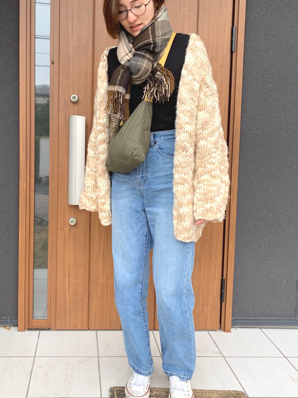 ニットカーデのインナーは、久しぶりの黒タートル。 ベージュのチェックストールあったか〜い♡