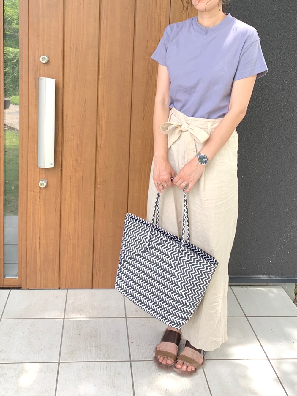 ユニクロのリネンパンツで楽チンコーデ。 今日はファーサンダルで👡