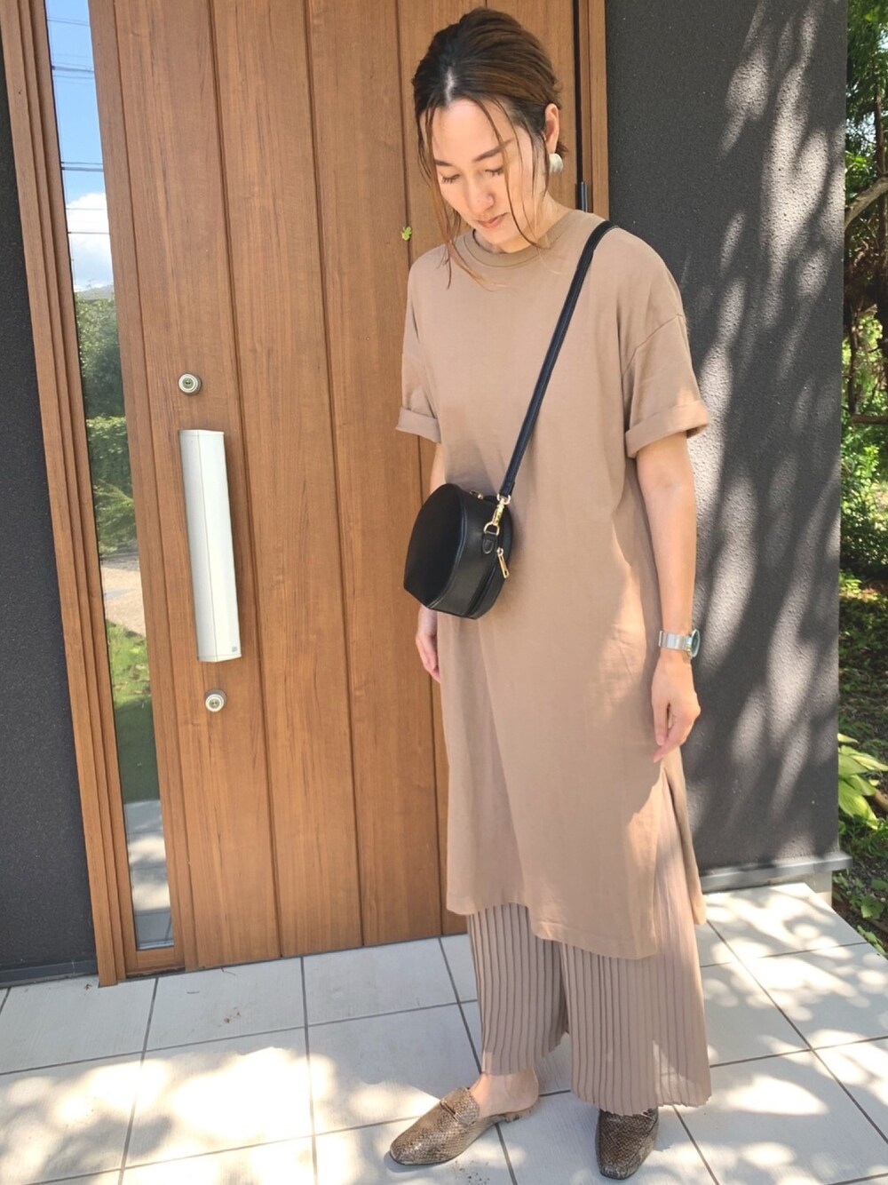 ベージュのワントーンコーデ。
