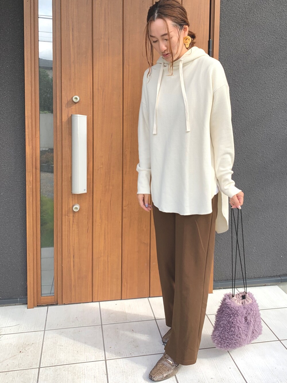 オーバーサイズのワッフルパーカーは、きれいめにもカジュアルにも使える1枚🙌🏻 最近巾着バッグばっかり使ってる😊