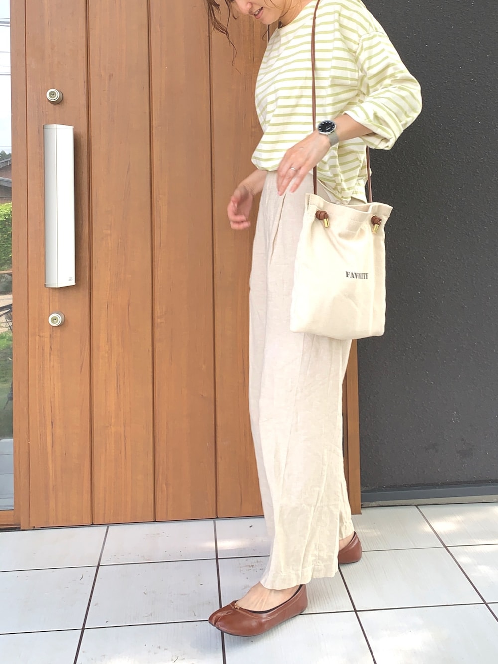 ブラウンのボーダーと色違いで、ピスタチオカラーも追加♡ 少しオーバーサイズなデザインでゆるっとした感じが可愛い! パンツはリネン素材で涼しげに。