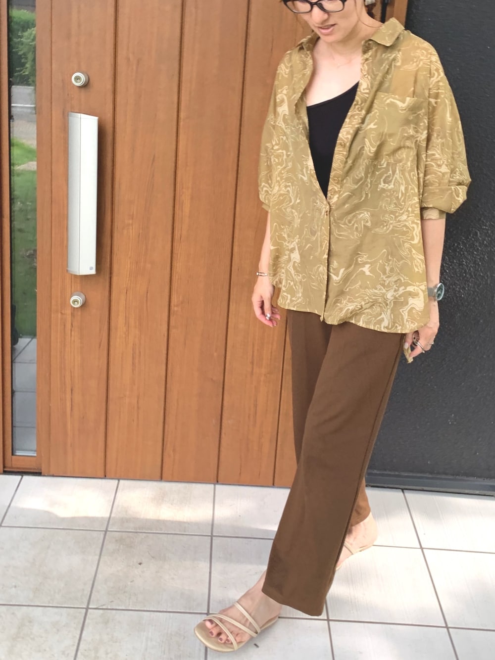 モヤモヤ柄と色味が秋っぽいシアーシャツ🍁 薄手でシアー素材なので今の時期は羽織りで使って、秋冬は上にニットを合わせてレイヤードしても可愛いかな〜