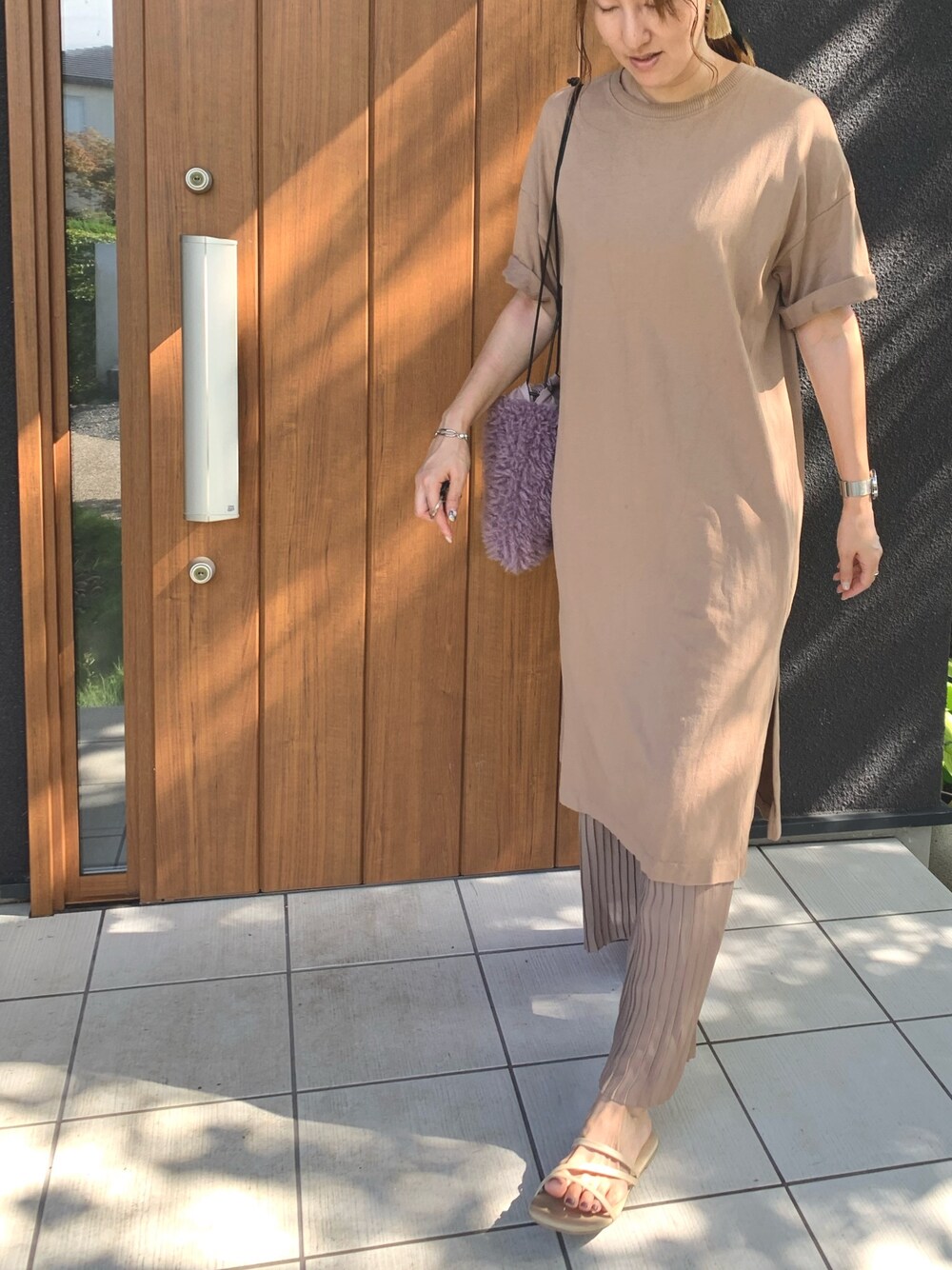 ワントーンコーデ🙌🏻 巾着バックもくすみカラーで秋っぽく🍁 そろそろサンダルも終わりかな、、、