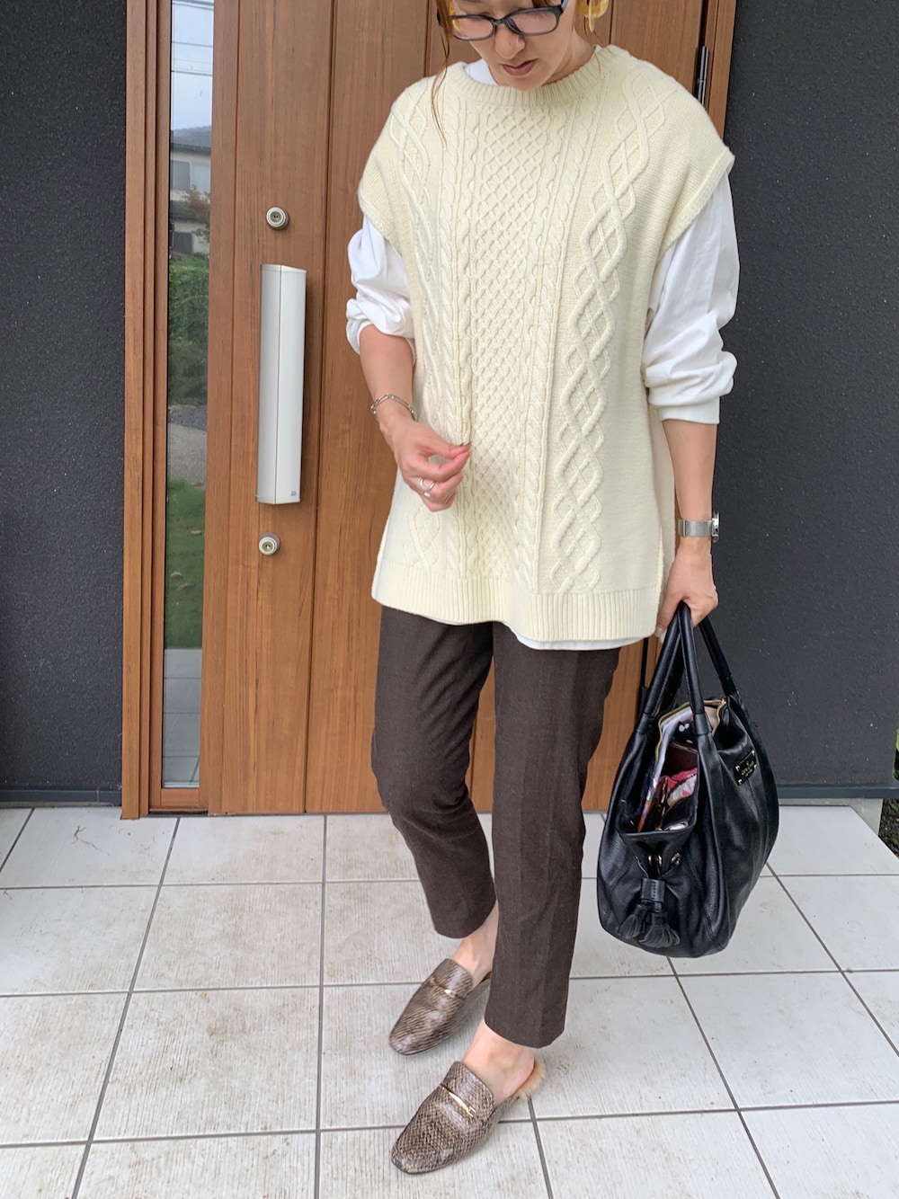 着回しコーデ🍁 ベストはこの時期使えるアイテム。 インナーを変えて柄シャツとか着ても可愛いなー