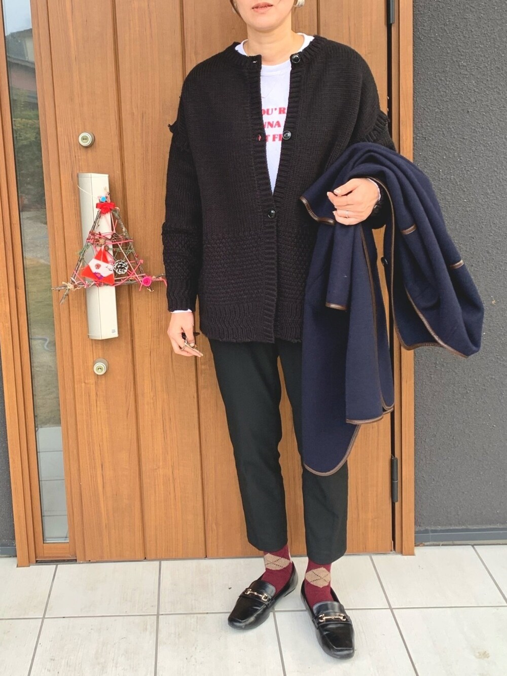 クリスマスコーデ🎄?! 職場のドレスコードはクリスマスカラーを取り入れる事😆 靴下とロゴの赤文字、ヘアアレンジにはグリーンのスカーフを巻いて♡