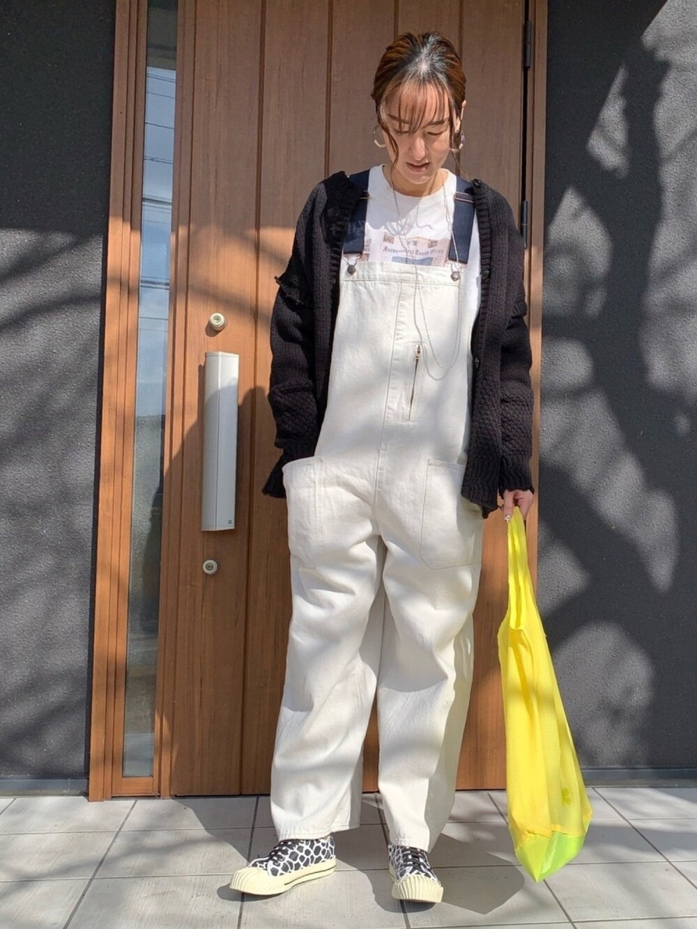 オーバーオールはLサイズで、かなりダボっとしたのを選びました😳 全身カジュアルなのも新鮮! スニーカーがポイント👟♡🦒