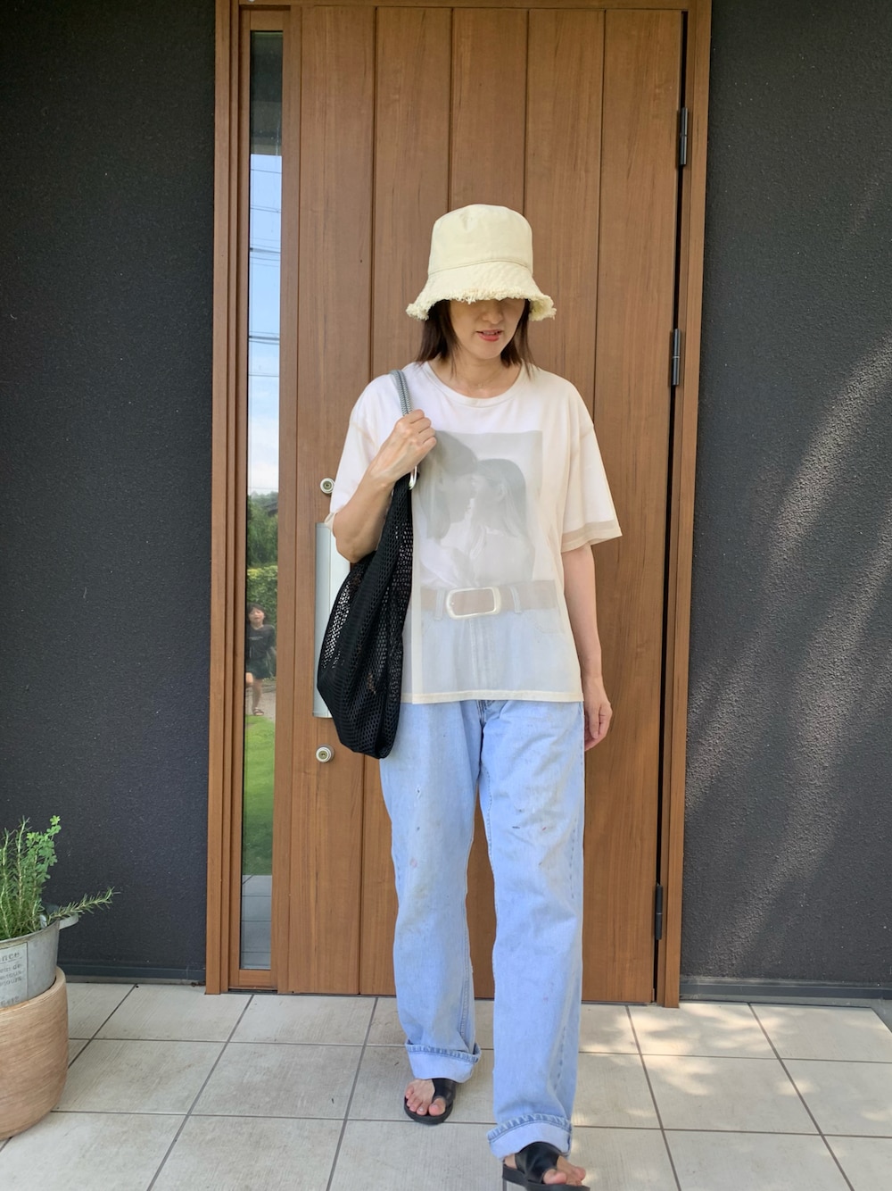 古着屋さんで買ったデニムは、メンズなのでだいぶ大きめ。ベルトしないとずり落ちてくる、、笑 ザラのシアーTシャツ2年前?の物やけど、今年でも全然着れるデザイン!シアーな感じが可愛い。