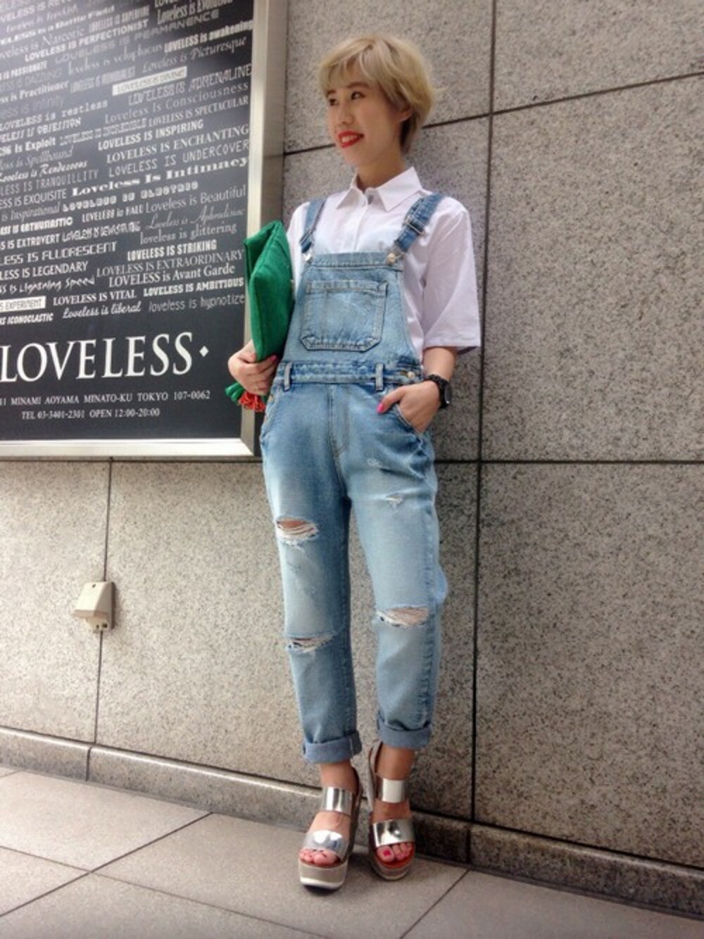 デニムオーバーオール×白シャツのシンプルコーデ★ 差し色のグリーンのクラッチがワンポイントです♪