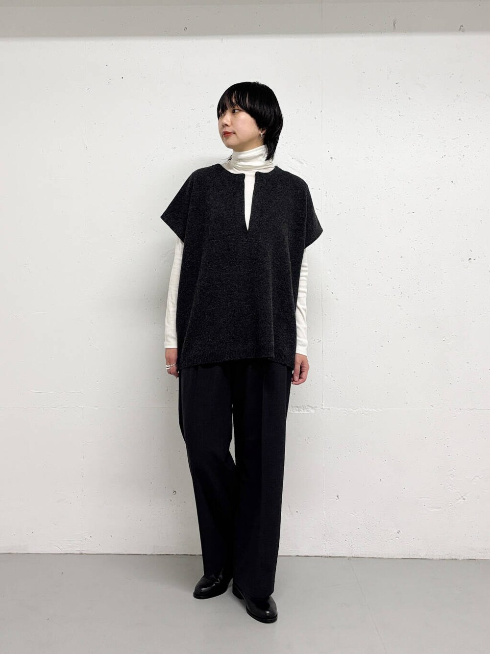 ベストとインナーはフリーサイズ パンツはサイズ1を着用しています。 おなか周りをさりげなくカバーするベストが主役。キーネックが大人っぽい印象です◎ ワンピースに重ねたり色んなコーディネートが楽しめそうです✨