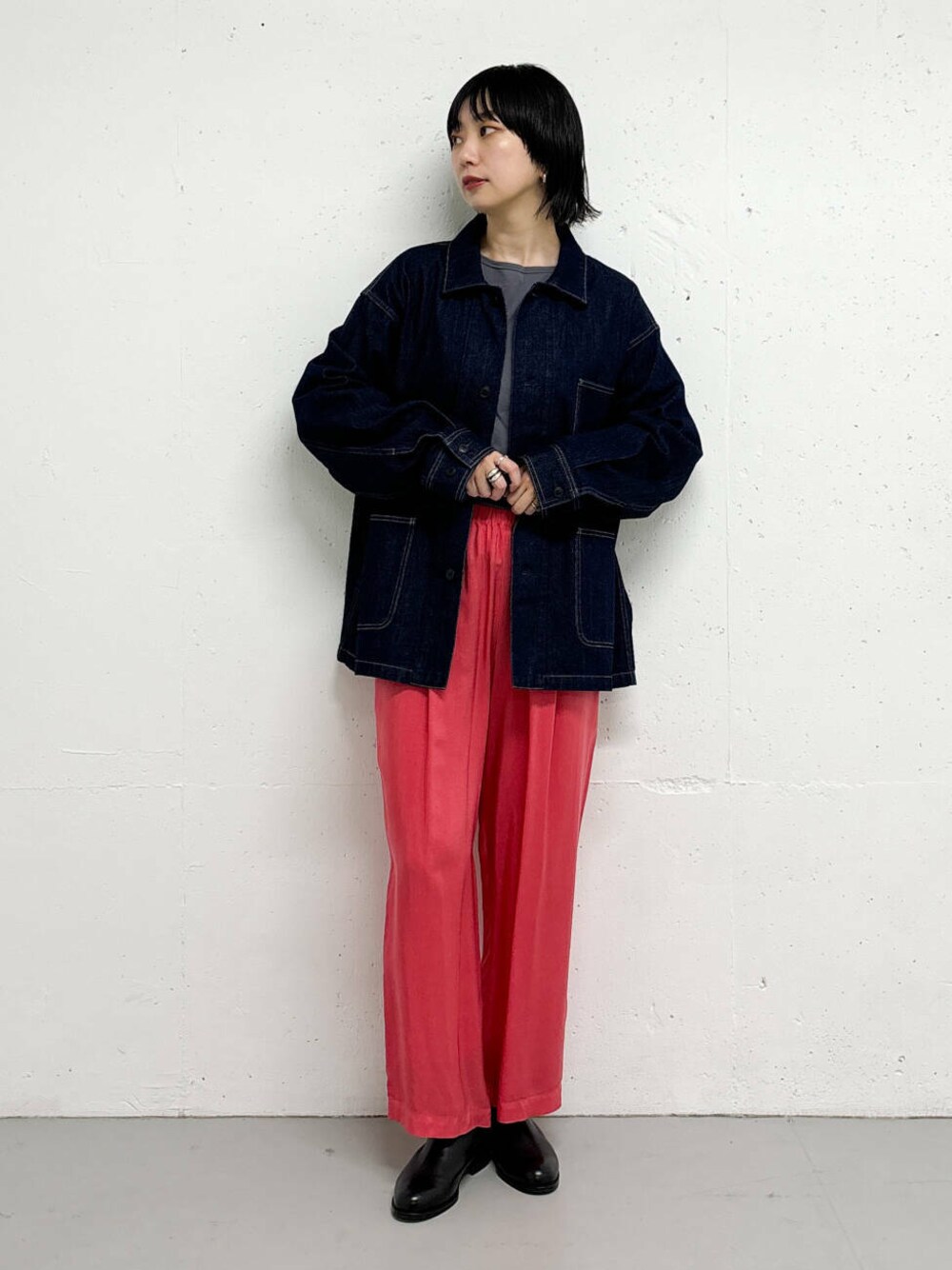 ユニセックスでお楽しみいただけるデニムカバーオール。 高身長の方は、今回私が着ているサイズ2がおすすめ! 腰回りをカバーしつつ、ざっくりと腕まくりするとこなれ感も演出できて◎ カラーパンツとも好相性です🍎 グレーのインナーを合わせて、アイテム同士の色差が強くなりすぎないようにしたのもポイントです。