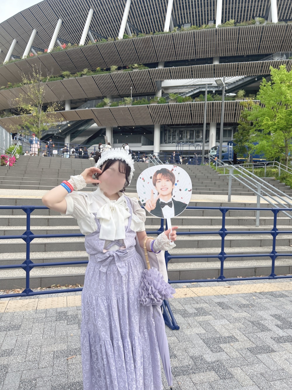 SnowManのドーム参戦服✊メンカラの紫ばっかり買ってしまう😇 スカートがレースで甘いのに、ヘアドレスもトップスも激甘ですんごくガーリーに仕上がってしまった笑かわいいのでおけです😌