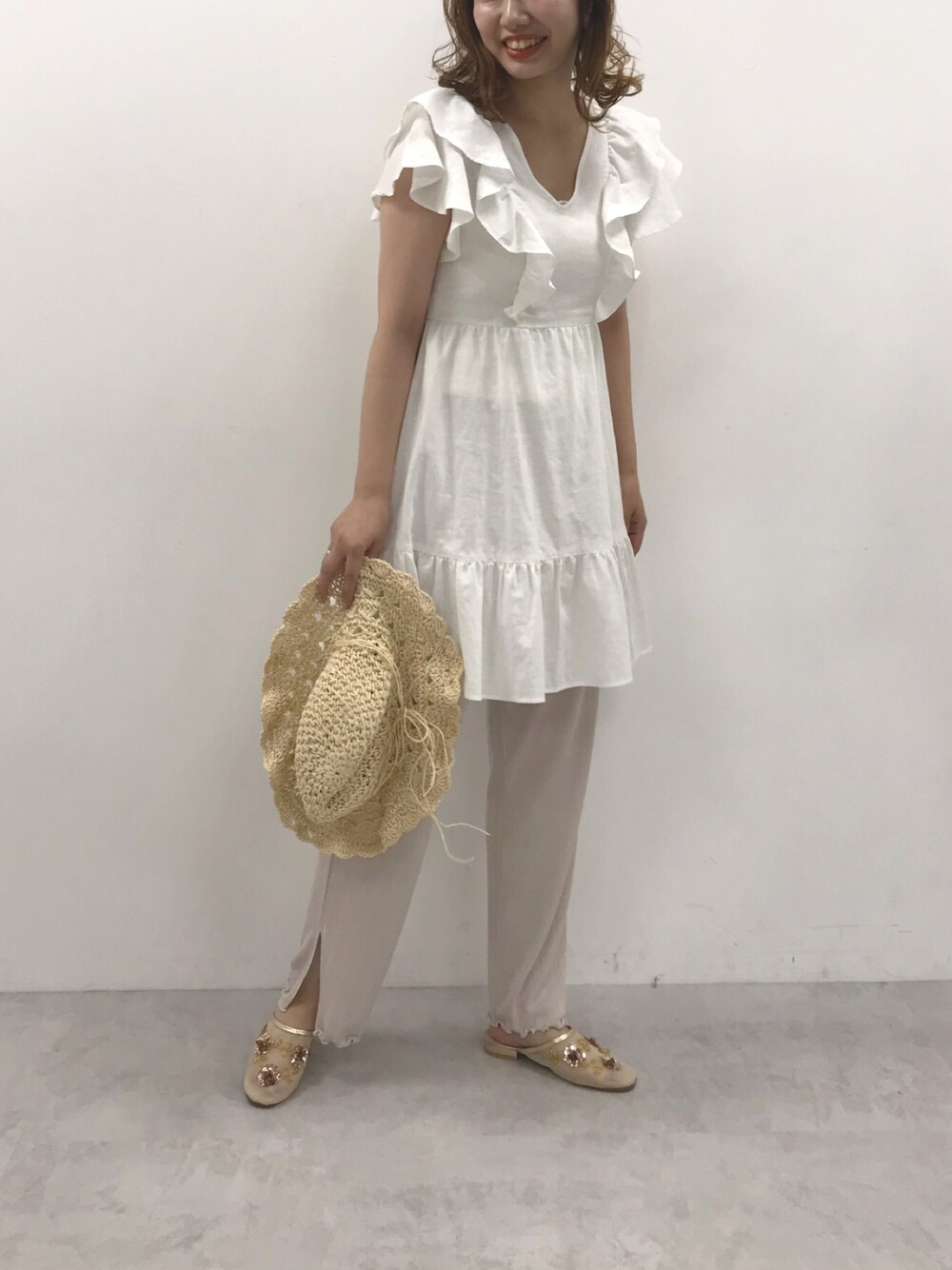 ホソヤヤスコ(one after another NICE CLAUP)のチュニック「【WEB限定色】フリルチュニックワンピース」を使ったコーディネート