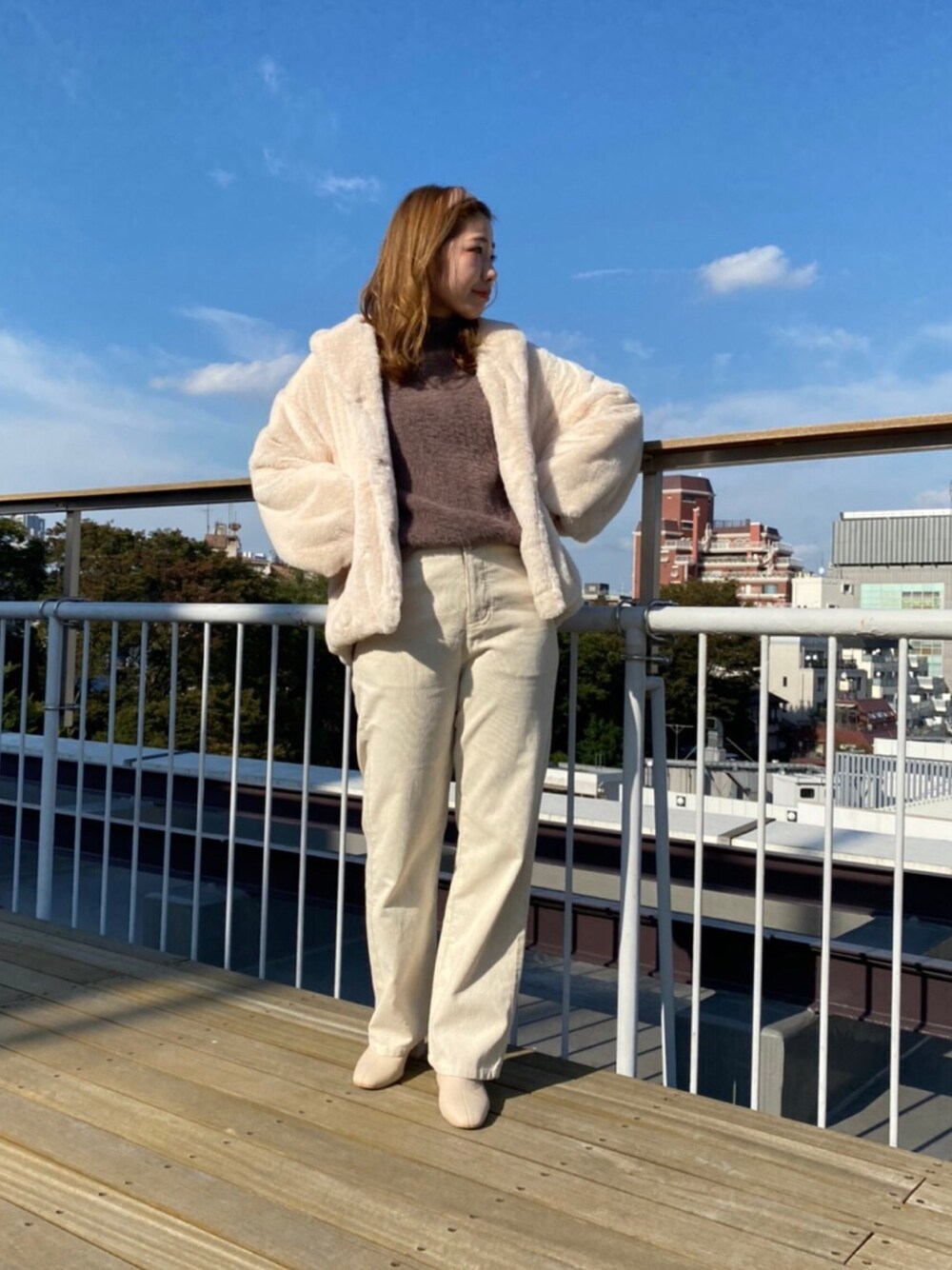 血色ニットの着まわしコーデ⑥ フェザーニットはシンプルなのでパンツスタイルにもおすすめです。 ファーコートはパンツと合わせることでカジュアルミックスで着れて、スタイリングのバリエーションが広がります◎ 《フェザーニット》 透け感:なし 伸縮性:あり 生地:軽い シルエット:ゆったり 素材感:柔らかい 着心地:ふわふわで暖かいです。 ちくちくしない 《コールテンハイウエストパンツ》 透け感:なし 伸縮性:なし 生地:凹凸あり シルエット:ストレート 素材感:しっかり 着心地:締め付けなし、ウエストゴムあり 《フェイクファーコート》 透け感:なし 伸縮性:なし 生地:厚め サイズ感:ゆったり 素材感:柔らかい 着心地:軽い、暖かい