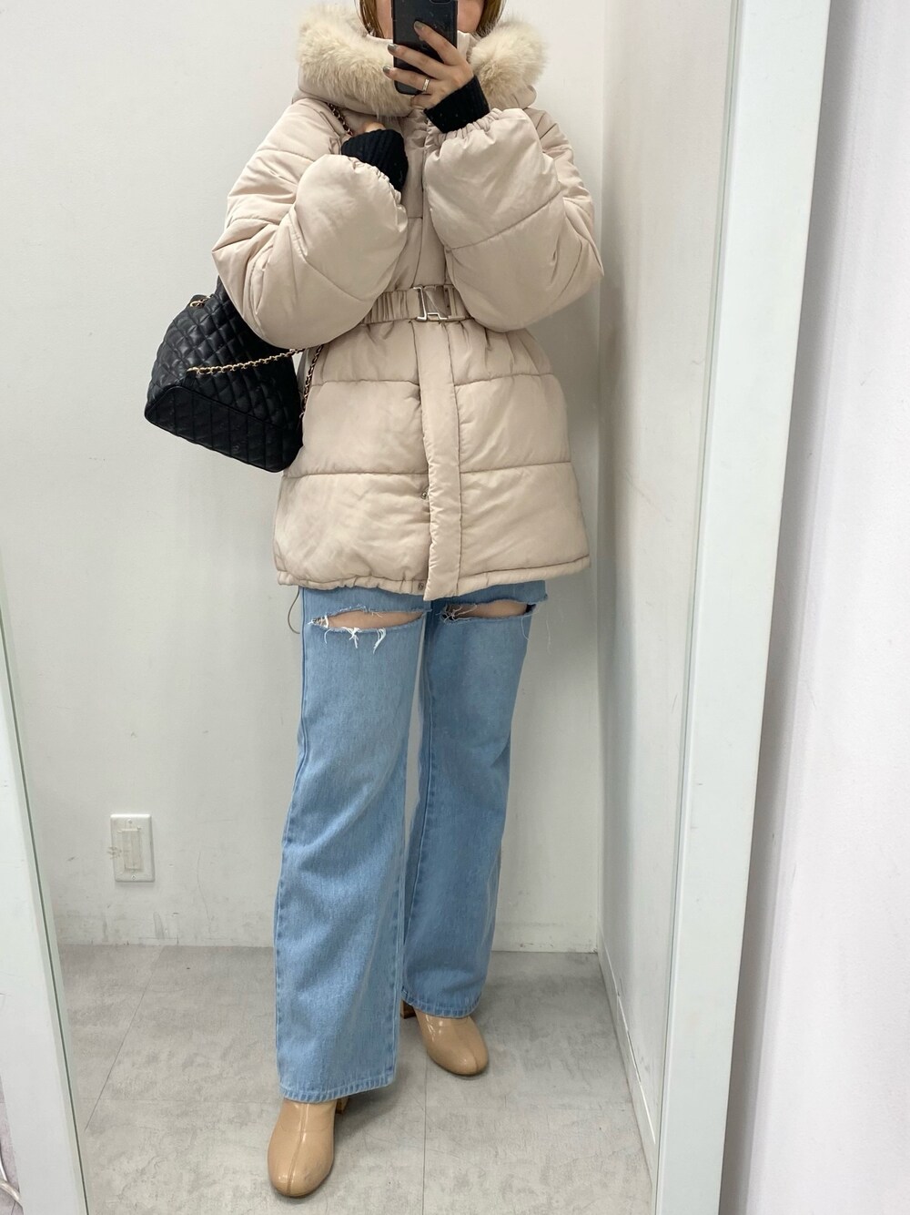 ホソヤヤスコ(one after another NICE CLAUP)のダウンジャケット/コート「ウェストマークファーミドルフェイクダウンコート」を使ったコーディネート