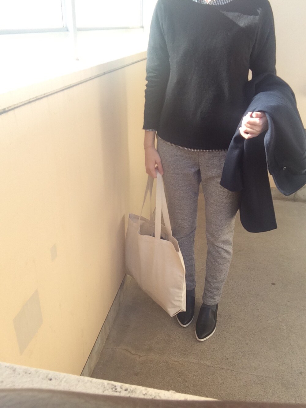 シャツ*無印 ニット*UNIQLO コート*MACKINTOSH PHILOSOPHY パンツ*UNIQLO スリッポン*Le Talon