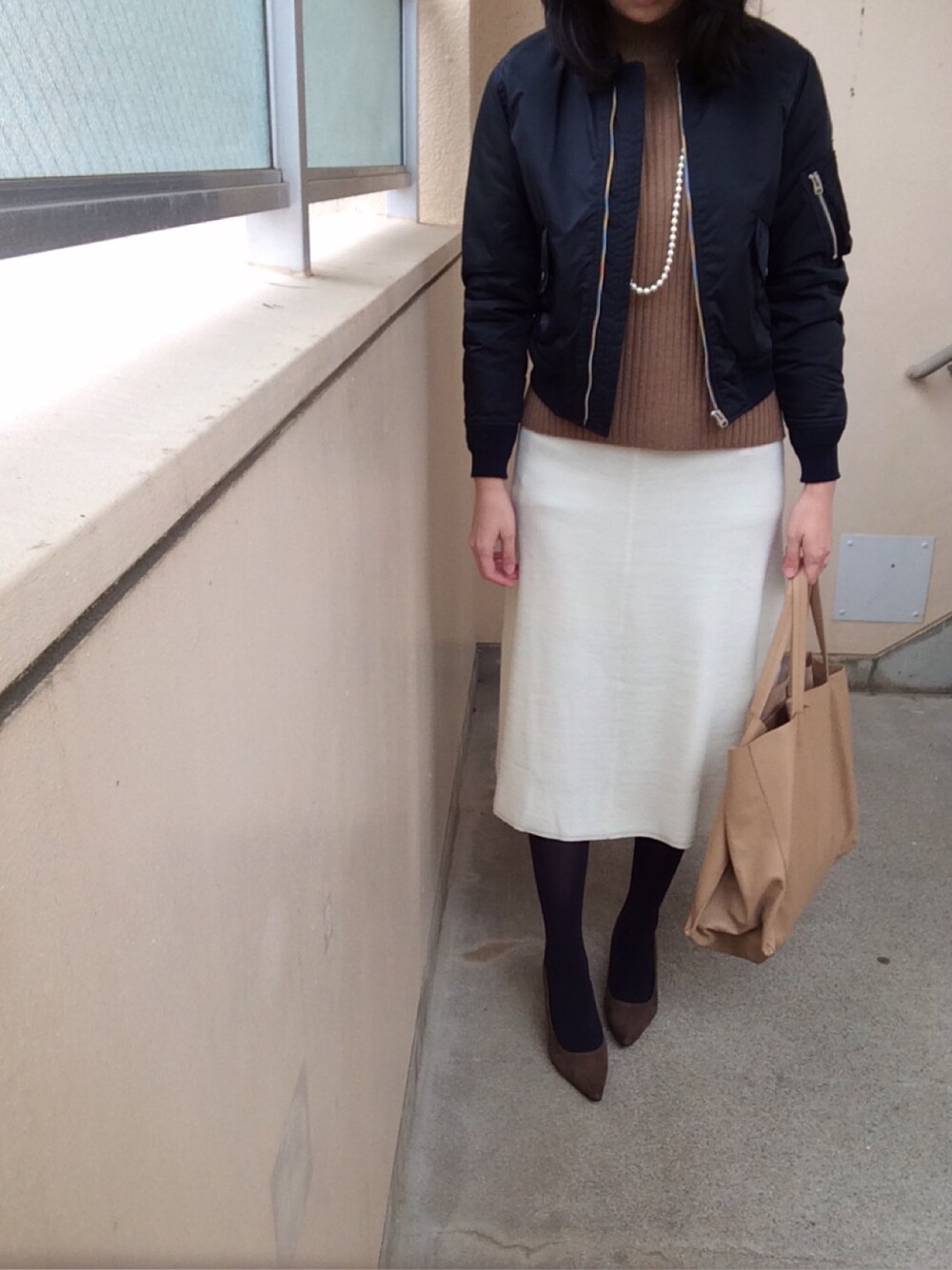 ニット*IENA スカート*UNIQLO×LEMAIRE MA-1*beautiful people バッグ*CELINE パンプス*アミアミ