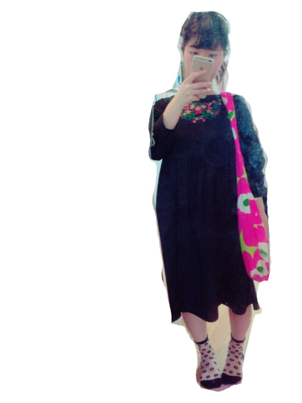 お気に入りのワンピース♪ マタニティではないですよ、 そう見えるけど、そこは内緒ってことで、、 黒にマリメッコが映えますね😊 だいすきなマリメッコちゃん😊