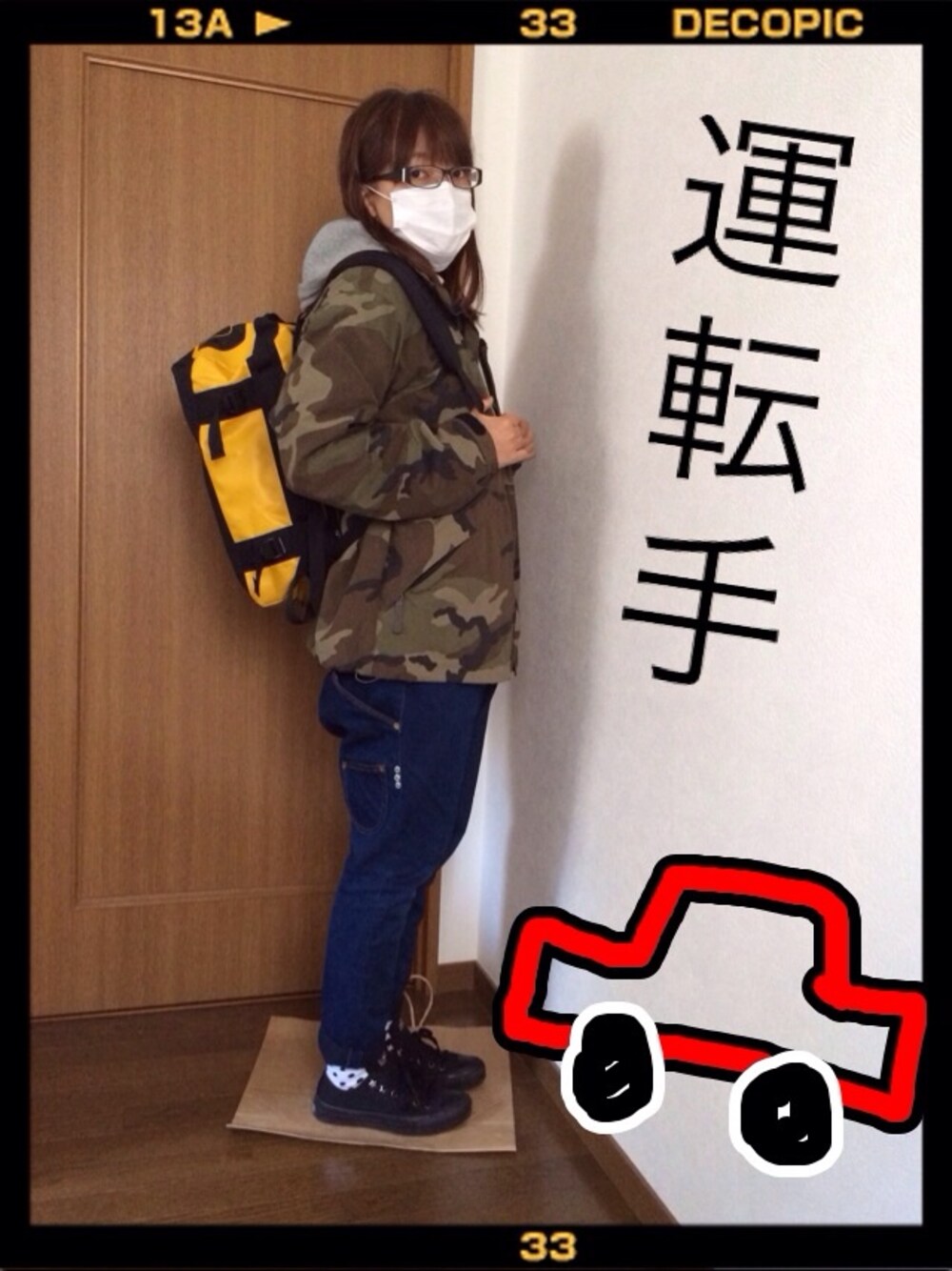 アウター○ノースフェイス パーカー○ユニクロ ボトムス○メルシーボークー 靴下○adidas 靴○コンバース メガネ○JIN'S 旅行に行くときはいつも車で私の運転です。 運転するときだけメガネをかけます。