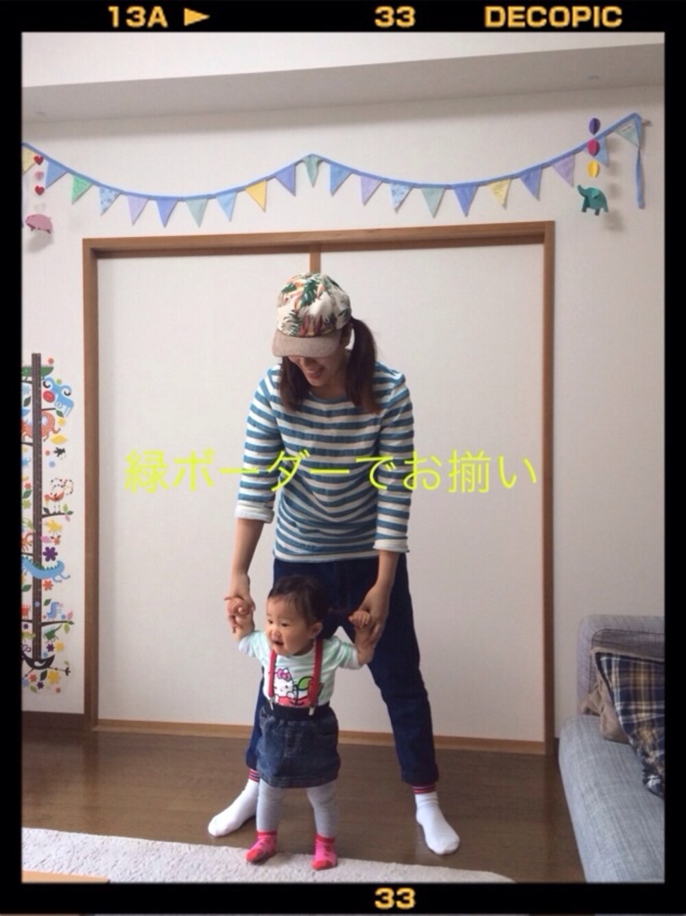 トップス○grn ボトムス○mercibeaucoup, 靴下○チュチュアンナ 帽子○OUTDOOR 娘と緑ボーダーでお揃いにしてみたんですが、写真だと分かりづらいですね… ツインテールもおそろ!