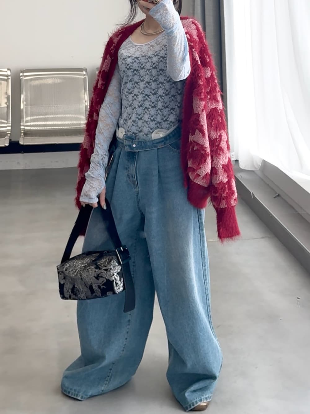yae staff(yae)のカーディガン/ボレロ「2way flower feather cardigan/2ウェイフラワーフェザーニットカーディガン」を使ったコーディネート