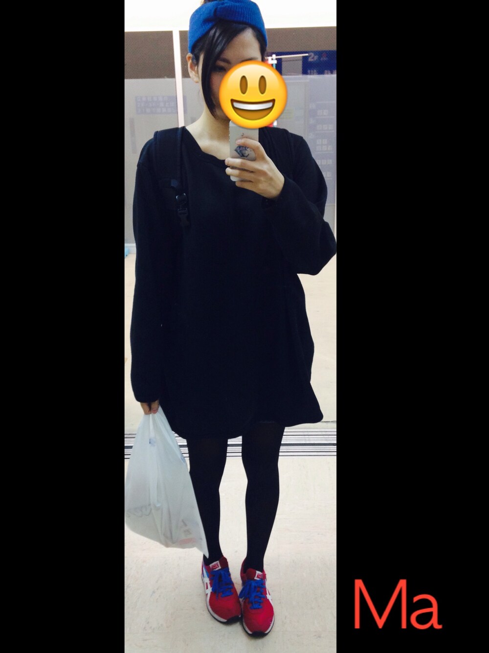 フリマでお兄さんから200円で買った真っ黒トップスはゆるゆるなので気に入ってます。 最近買ったオニツカタイガーのエクスカリバーの靴紐の青と、好きなヘアバンドの青が一緒だったので付けてみました(´-`).。oO( ちゃんとズボン履いてまっせ(´-`).。oO(