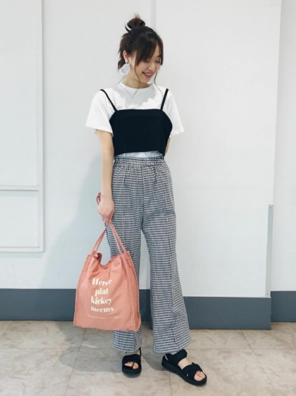 ご覧頂きありがとうございます! 今回は、新作のパイピングビスチェセットを使ったコーディネートです。 Tシャツとビスチェがセットになって¥2,198とお買い得な商品です。 パンツは、トレンドのギンガムチェック柄のパンツです。センタープレスが入っているので脚を綺麗にみせてくれます。 他にも色があるのでチェックしてみて下さい。