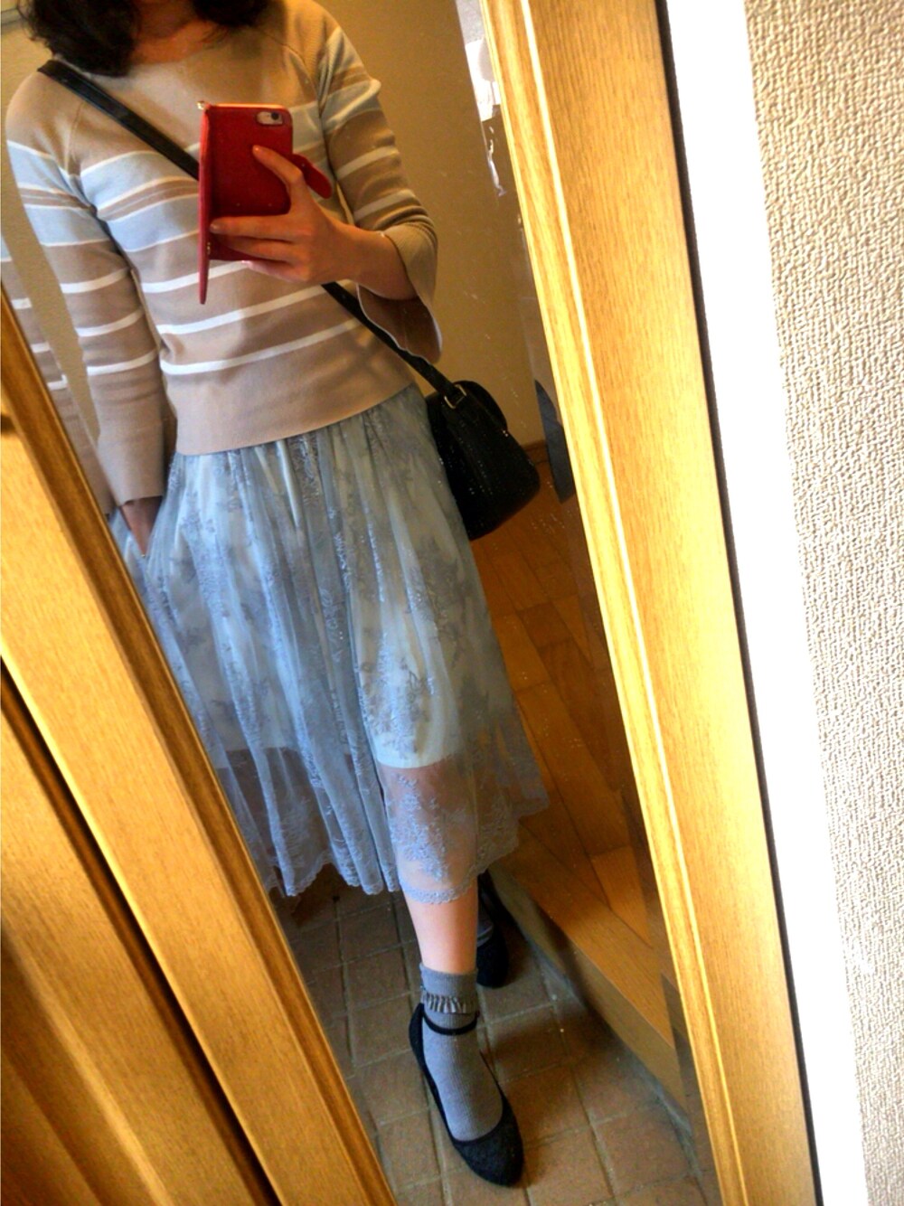 去年のセールで買ったトランテアンのスカート 膝下が透けるデザインで可愛い😊 今年のティティーアンドコーのトップスは 珍しいデザイン(。・ω・。)