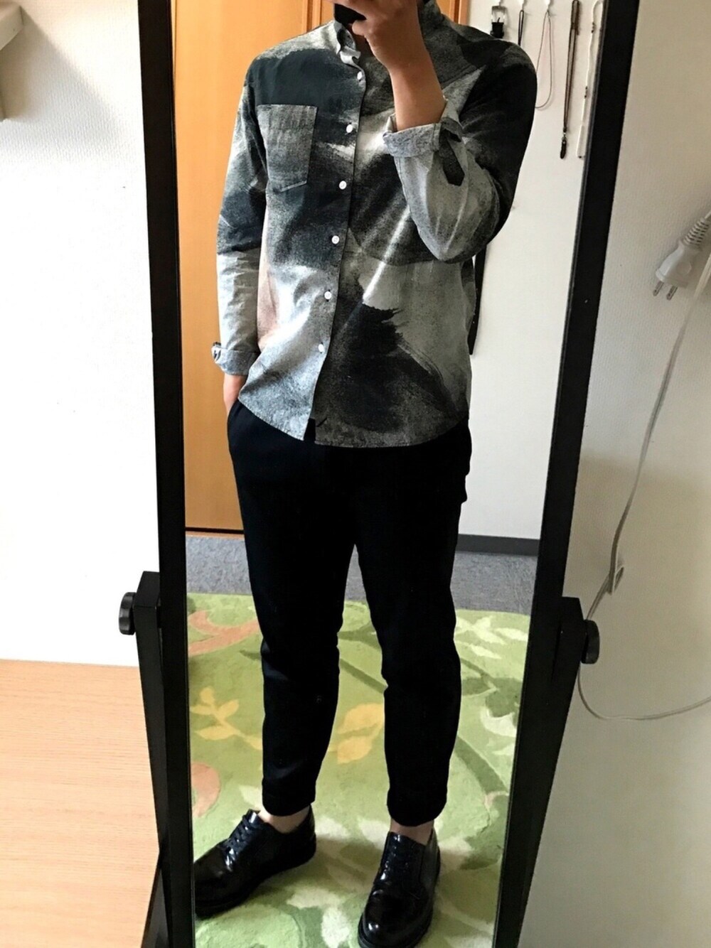柄の強いシャツをワントーンで!! シャツにスラックスを合わせてキレイめに仕上げました。 春っぽさを出すためにくるぶしを出したり、腕まくりをしたりして軽さを出しました。 シャツが好きなので、おすすめの柄シャツやシャツがあれば教えてください🙇