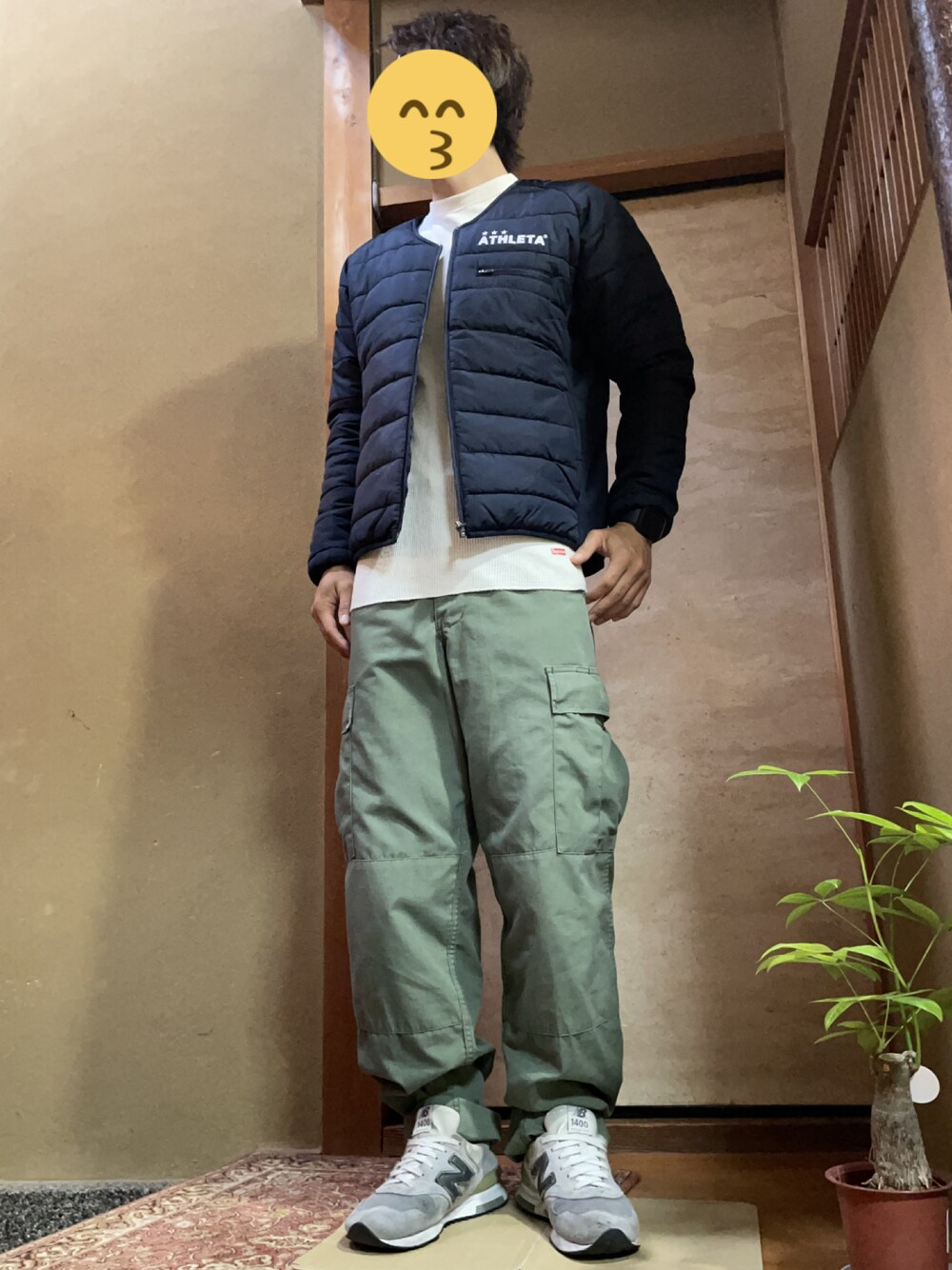 ライトなダウンを出しました アウターはATHLETA インナーはHanes×supremeのBEEFYサーマル パンツは軍物NOBRAND スニーカーはNew Balance1400