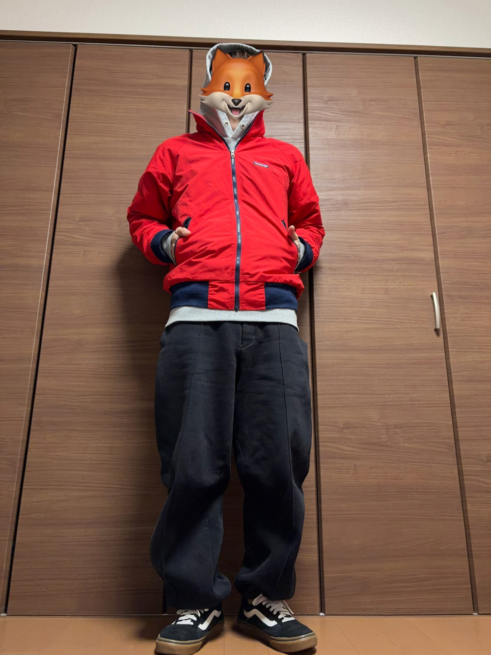 好きな赤色♥️ アウターはPatagoniaのシェルドシンチラ パーカーはギルダン パンツはengineered garments×GU スニーカーはVANSのオールドスクール