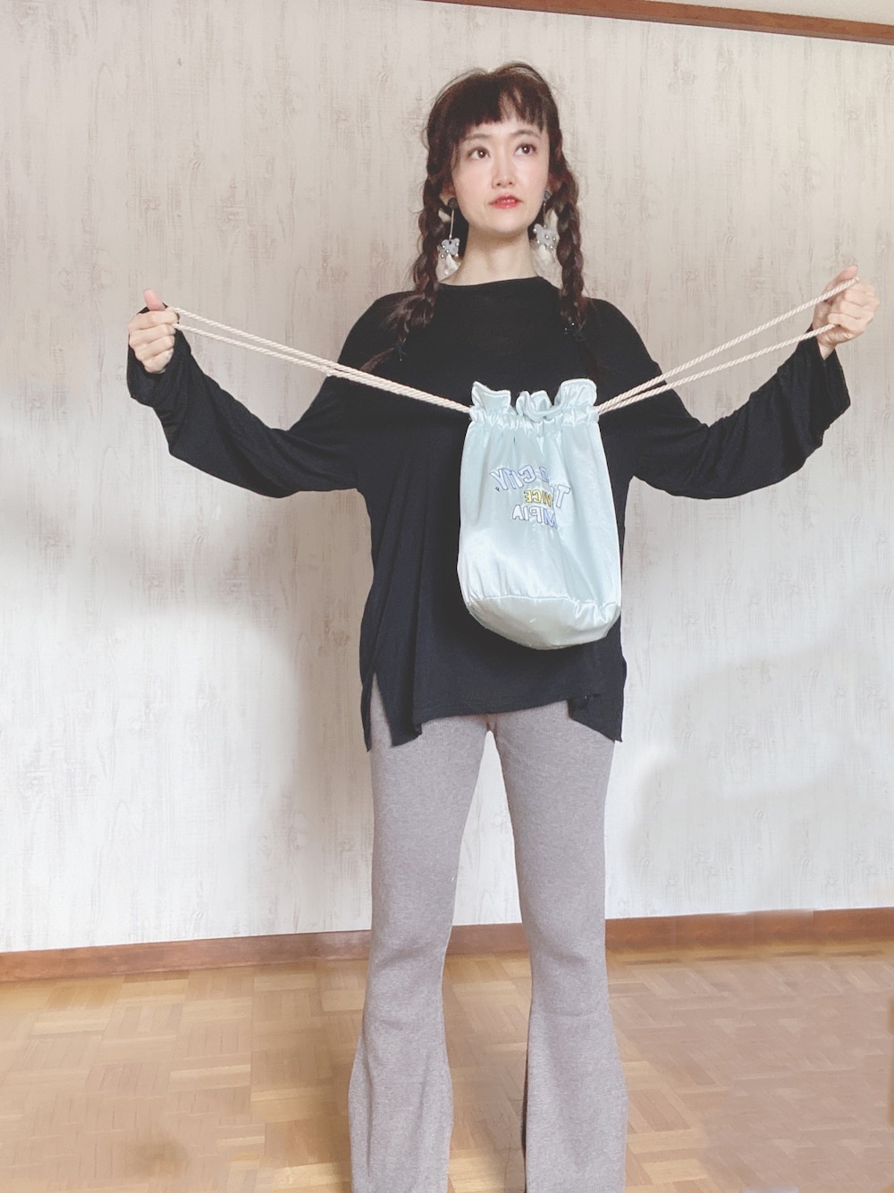 IU 𓁫のショルダーバッグ「サテン刺繍巾着/AEBFC EMB キンチャク◆」を使ったコーディネート
