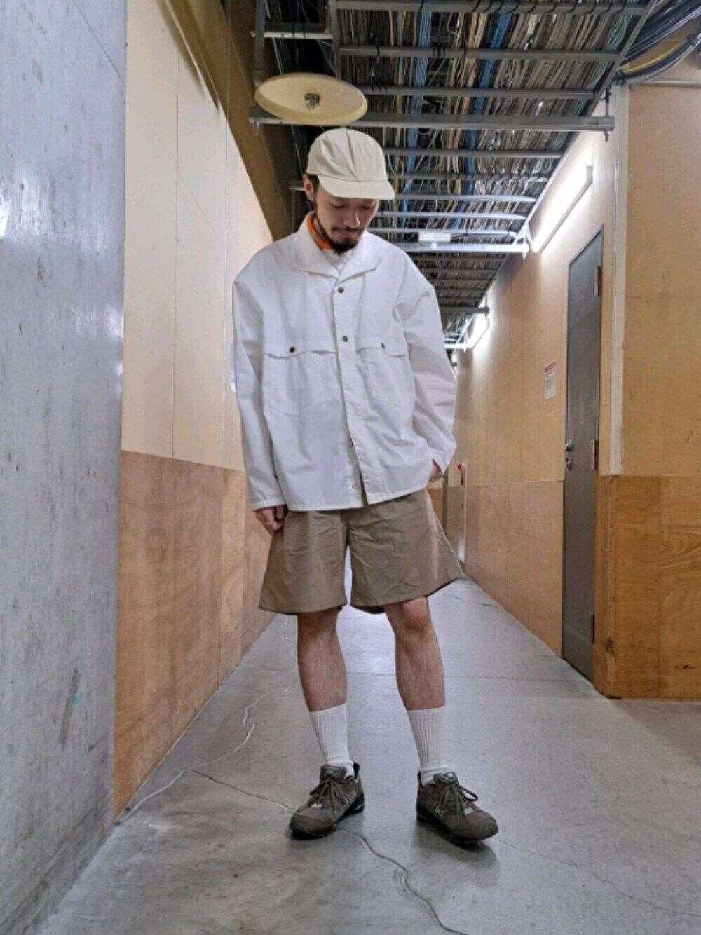 大人のショーツコーデ 大人の休日コーデ 大人のボーイスカウトなコーデ という感じに ホワイト系、ベージュ系でまとめた 大人の爽やかコーデ 差し色にオレンジのバンダナを巻きました