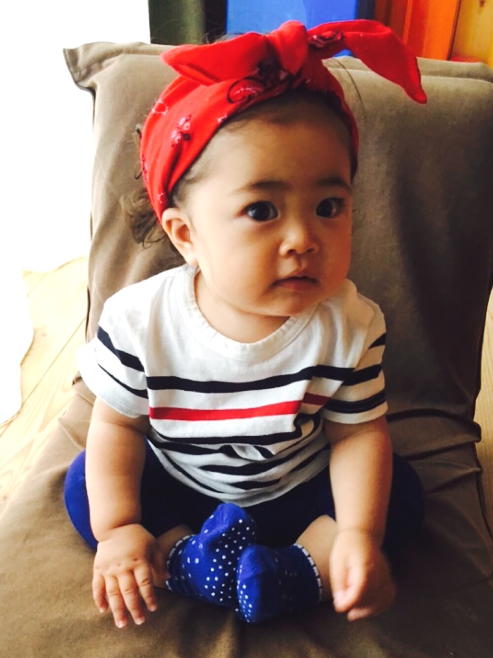 ボーダーT×レギンス。 何か物足りなかったので赤いバンダナを巻いてみました🌀 今日はお友達が参加しているマルシェに行ってきました🚗美味しいものをたくさん買ったり、ワークショップでピアス作ったり大満足😊 娘も大人しくしてくれたので助かりましたー😁