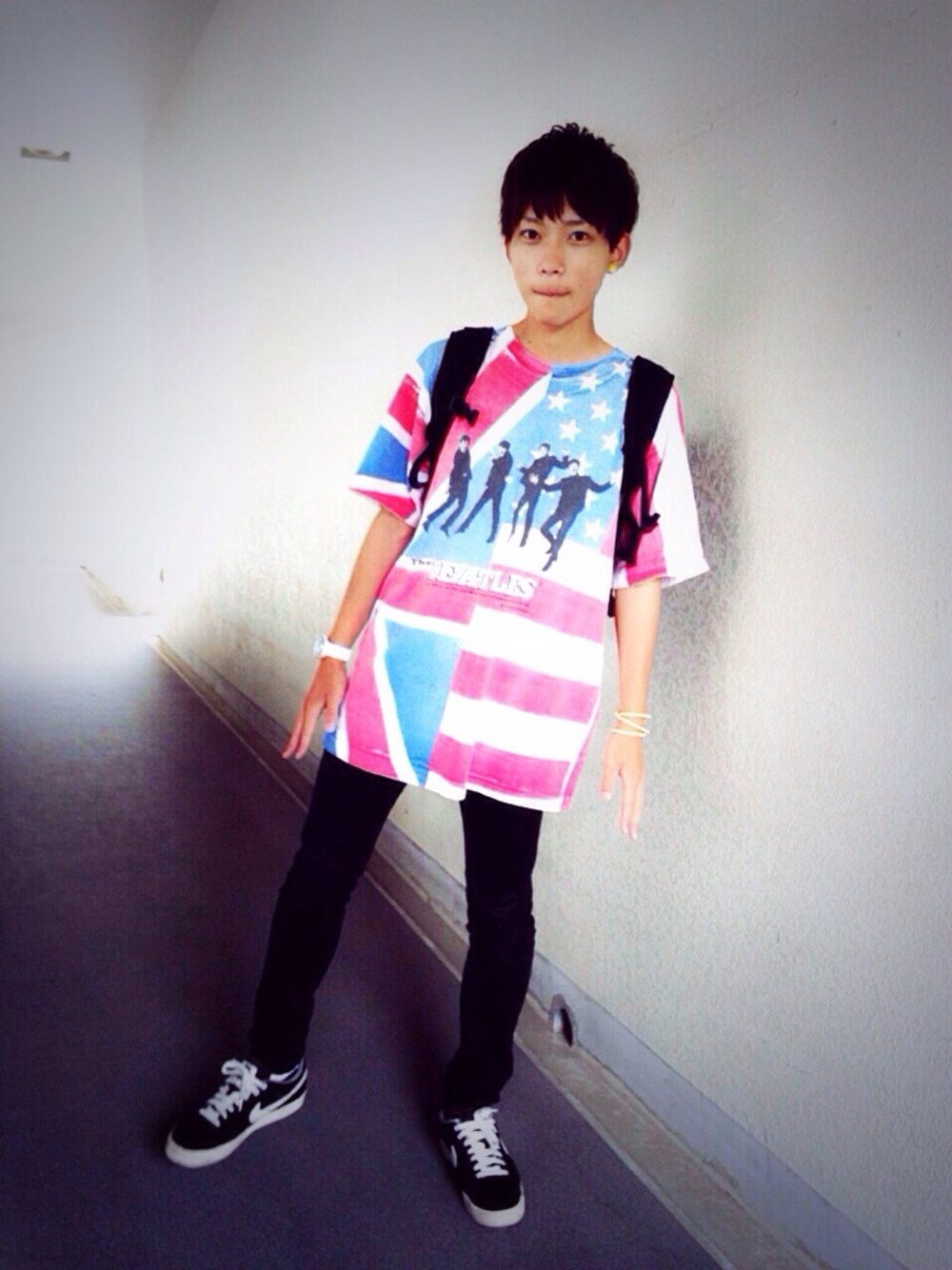 ビートルズのシャツ アメリカ🇺🇸とイギリス🇬🇧の国旗が組み合わさってておもしろい! オーバーサイズなので一枚で着るのに最適です!