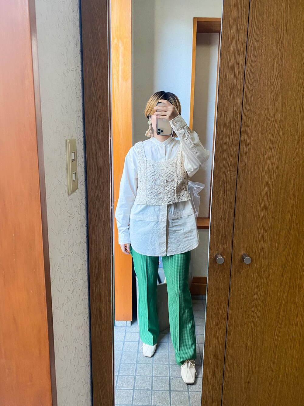 今日の沖縄はまるで夏でした🌷セールで激安になってた緑のパンツを、アイボリーでまとめて春コーデをしてみました〜