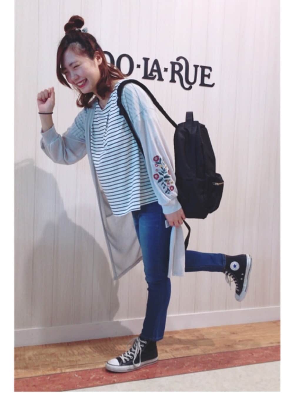 こんにちは😊 いつもフォロー、いいねありがとうございます☺️ 本日のコーデです✔️ 袖にレースリボンが付いているボーダーカットソーに流行りの刺繍カーデです☺️☘️ カーデを脱いでも袖のデザインが目立っていてカワイイです☺︎ 今回は動きやすさ重視で考えてみました! その理由は、、今週末の土日、私が住んでいる白河で「ご当地キャラ夢フェスタ」という全国のゆるキャラが集まるイベントがあるからです✨ たくさんのゆるキャラと写真撮り放題なので走って追いかけようと思います笑 最後までご覧いただきありがとうございます❤️