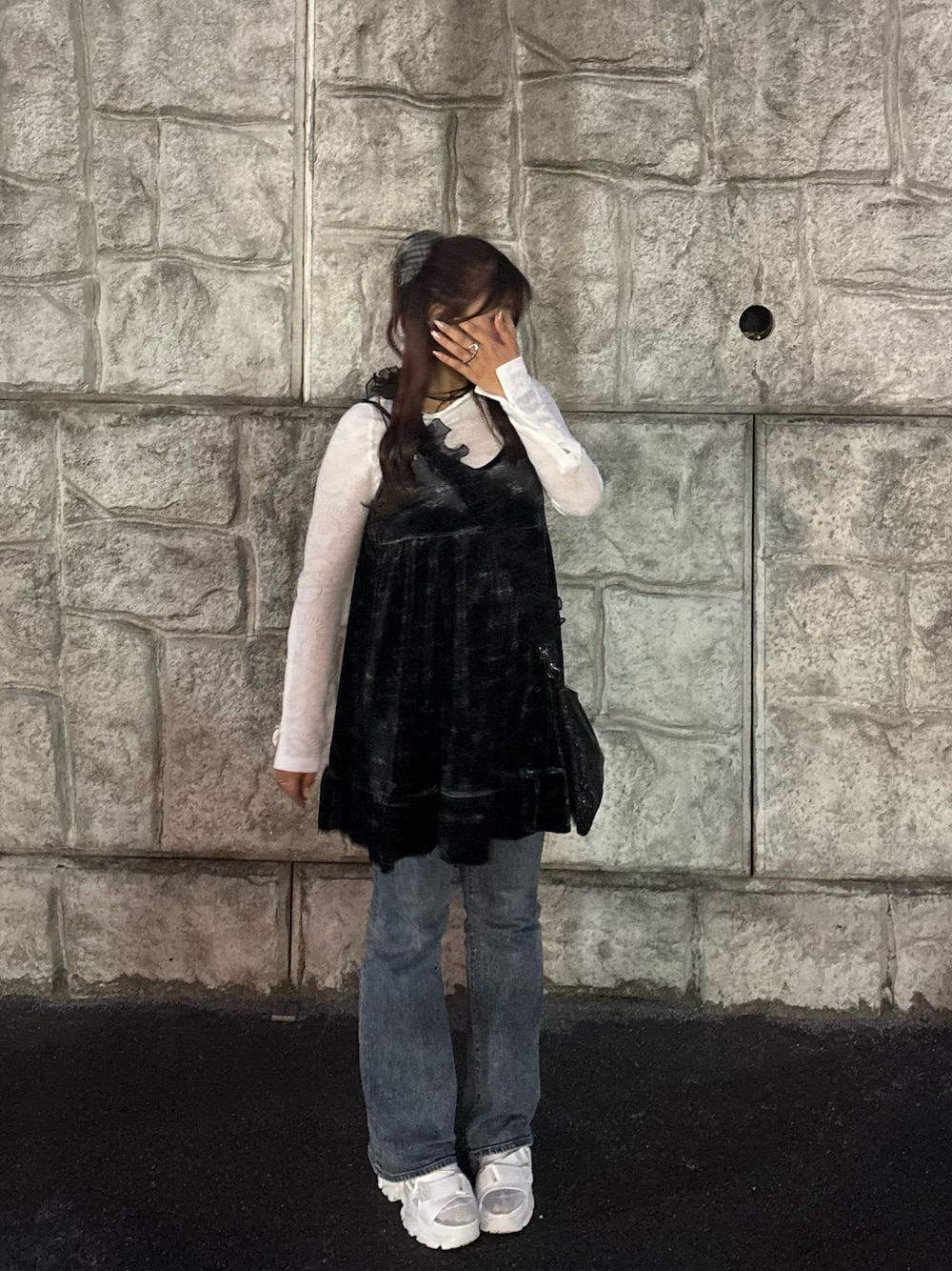 仙台でのライブ参戦日、秋らしく長袖が心地よかったです😌 レースジャガードのトップスをインナーにして、ベロアキャミワンピとデニムをレイヤード✨ 甘さのあるトップスにカジュアルなパンツを合わせて、バランスよく仕上げました◎