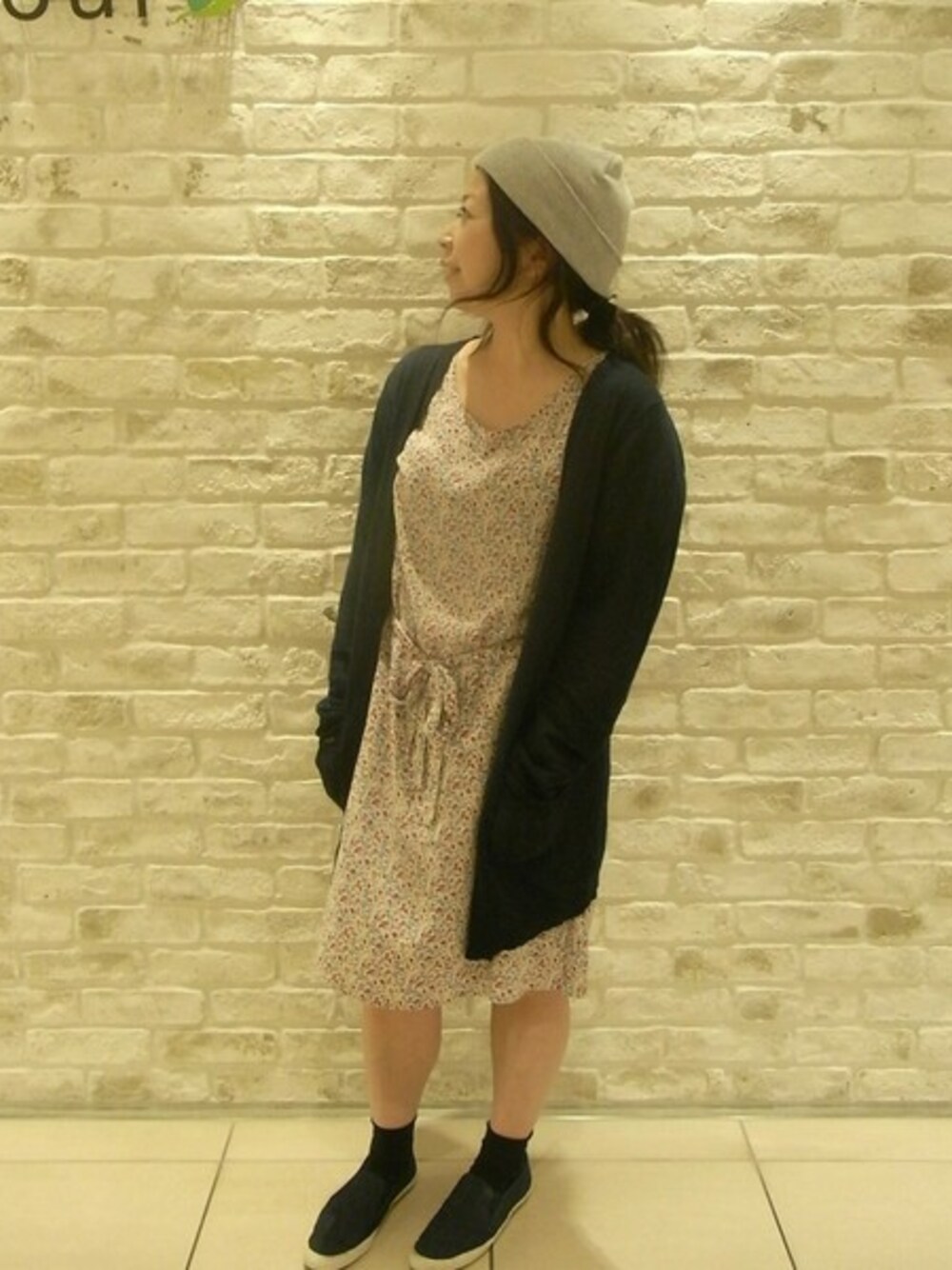 麻&レーヨンのカーディガンに小花柄ワンピースを合わせて♪
