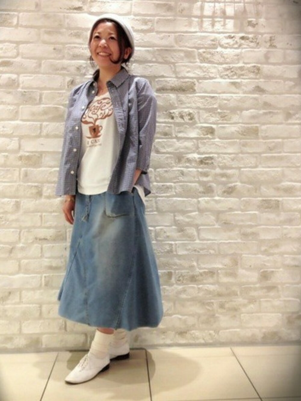 架空のカフェR.J CAFEのTシャツにギンガムチェックのシャツとスウェットデニムスカートを合わせてナチュラルスタイル♪