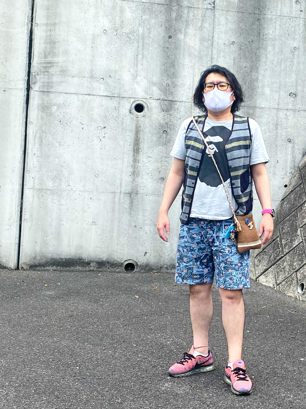 太ってきたので、ベストを着用 差し色にピンクのNIKEスニーカーです。